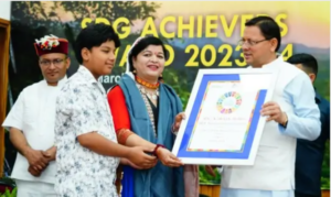 देहरादून: मुख्यमंत्री पुष्कर सिंह धामी ने सोमवार को एस.डी.जी अचीवर अवार्ड समारोह में 3 व्यक्तियों, 09 संस्थानों और 04 औद्योगिक प्रतिष्ठानों को एसडीजी अचीवर अवार्ड से सम्मानित किया। पिछले वर्ष के एसडीजी अवॉर्ड से पुरस्कृत व्यक्तियों और संस्थानों द्वारा की जा रही अभिनव पहलों की पुस्तक ‘अग्रगामी 2.0’ और एसडीजी इंडेक्स उत्तराखण्ड 2023-2024 का लोकार्पण भी इस अवसर पर मुख्यमंत्री ने किया। सी०पी०पी०जी०जी० द्वारा वर्ष 2023-24 के लिए जारी जनपदवार एस०डी०जी० रैंकिंग में नैनीताल जनपद ने प्रथम स्थान, देहरादून दूसरे और उत्तरकाशी तीसरे स्थान पर रहे, तीनों जनपदों के मुख्य विकास अधिकारी को मुख्यमंत्री द्वारा सम्मानित किया गया।