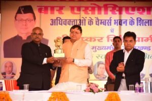 मुख्यमंत्री ने कहा कि देहरादून बार एसोसिएशन के चैम्बर भवन की मांग भी काफी लंबे समय से चल रही थी, इसके संबंध में बार एसोसिएशन के साथ अखिल भारतीय अधिवक्ता परिषद के पदाधिकारियों ने भेंट कर नए भवन हेतु जमीन की मांग की थी। मुख्यमंत्री ने कहा कि यहां पर कुल साढ़े पांच हजार से ज्यादा लोग कार्यरत हैं। इसलिए सभी की समस्याओं को समझते हुए पांच बीघा जमीन बार एसोसिएशन देहरादून को देने का निर्णय लिया था। उन्होंने कहा कि मुझे खुशी है कि इस जमीन पर 1500 चैम्बर, एक ऑडिटोरियम, लाइब्रेरी, कैंटीन, पार्किंग से भरपूर नौ मंजिला भवन का निर्माण करवाया जाएगा। उन्होंने कहा कि इस भवन निर्माण के लिए हर संभव सहयोग दिया जायेगा।
