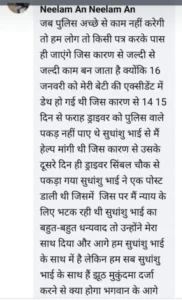 जब पुलिस अच्छे से काम नहीं करेगी तो हम लोग तो किसी पत्रकार के पास ही जाएंगे । जिस कारण से जल्दी से जल्दी काम बन जाता है । क्योंकि 16 जनवरी को मेरी बेटी की एक्सीडेंट में डेथ हो गई थी जिस कारण से 14- 15 दिन से फराह ड्राइवर को पुलिस वाले पकड़ नहीं पाए थे। सुधांशु भाई से मैंने हेल्प मांगी थी जिस कारण से उसके दूसरे दिन ही ड्राइवर को सिम्भल चौक से पकड़ा गया। सुधांशु भाई ने एक पोस्ट डाली थी । जिसमें जिस पर मैं न्याय के लिए भटक रही थी सुधांशु भाई का बहुत-बहुत धन्यवाद तो उन्होंने मेरा साथ दिया और आगे हम सुधांशु भाई के साथ में है लेकिन हम सब सुधांशु भाई के साथ हैं । सुधांशु भाई ने मेरी मदद की थी मैं उनके साथ खड़ी रहूंगी भले ही मुझे धरना ही क्यों न देना पड़े।
