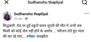 गौरतलब है कि 16 जनवरी को सिद्धबली रोड के पास एक कार चालक ने स्थानीय युवती की स्कूटी को टक्कर मार दी। कार की टक्कर से मौके पर ही युवती अंजलि थापा की मौत हो गयी। युवती की मौत के 12 दिन बाद भी दोषी वाहन चालक के नहीं पकड़े जाने पर मृतका की मां ने पत्रकार सुधांशु थपलियाल से सम्पर्क किया।