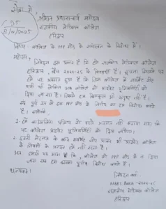 2024-25बैच के एमबीबीएस छात्र राजकीय मेडिकल कालेज के प्रधानाचार्य को पत्र लिख कर अपना विरोध जताया।