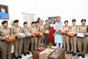 देहरादून: कैबिनेट मंत्री गणेश जोशी के शासकीय आवास में आज रक्षाबंधन के पावन अवसर पर उत्तराखंड पुलिस की बहिनों ने कैबिनेट मंत्री गणेश जोशी को राखी बांधकर उनके दीर्घायु की कामना की और रक्षाबंधन की शुभकमानाएं दी। महिला पुलिसकर्मियों ने उन्हें तिलक लगाया और उन्हें मिठाई खिलाई। कैबिनेट मंत्री गणेश जोशी ने पुलिस की बहिनों को उपहार भी भेंट किया।