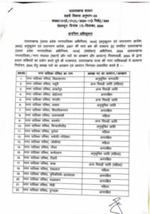 उत्तराखण्ड (उत्तर प्रदेश नगर निगम अधिनियम, 1959) (अनुकूलन एवं उपान्तरण आदेश, 2002) अनुकूलन एवं उपान्तरण आदेश, 2007 की धारा 7 की उपधारा (5) सपठित उत्तराखण्ड (उत्तर प्रदेश नगर निगम अधिनियम, 1959) (द्वितीय संशोधन) अध्यादेश, 2024, उत्तराखण्ड नगर निगम (स्थानों और पदों का आरक्षण और आवंटन) नियमावली, 2024 के द्वारा प्रदत्त शक्तियों का प्रयोग करते हुये राज्यपाल, उत्तराखण्ड राज्य की नगर निगमों,नगर पालिका व नगर पंचायत में सामान्य निर्वाचन, 2024 हेतु नगर प्रमुख के पदों का आरक्षण एवं आवंटन निम्नवत प्रस्तावित करते है:-
