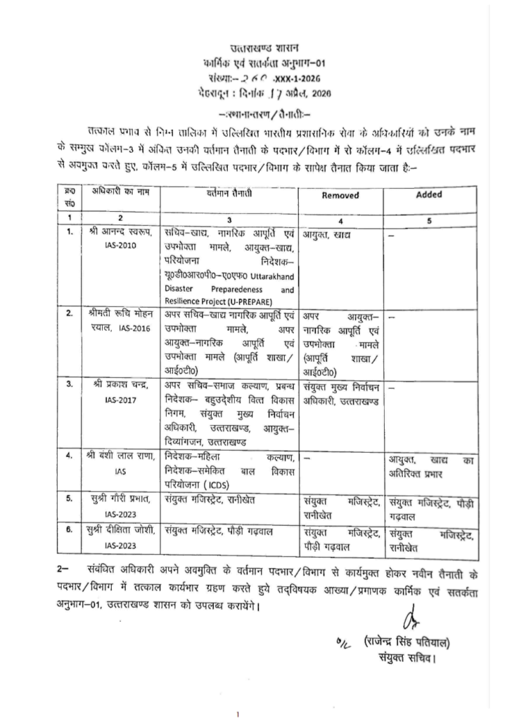- आनंद स्वरूप, रुचि मोहन रयाल, प्रकाश चन्द्र, बंशी लाल राणा सहित कई आईएएस अधिकारियों के कार्यक्षेत्र में परिवर्तन किया गया।